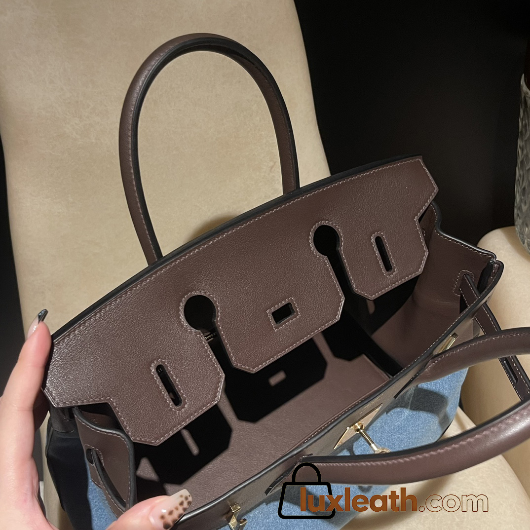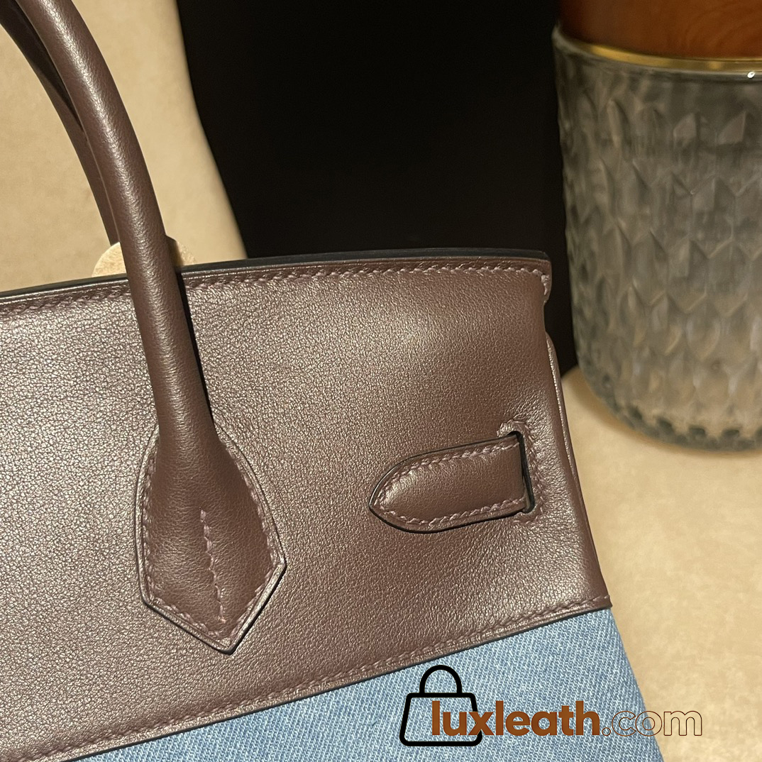 30cm Birkin (Swift Leather & Denim Canvas) – Color: 46/Ebene with Gold Hardware The perfect combination of Swift leather and canvas creates a profound vintage mood – a rare item with excellent investment potential.