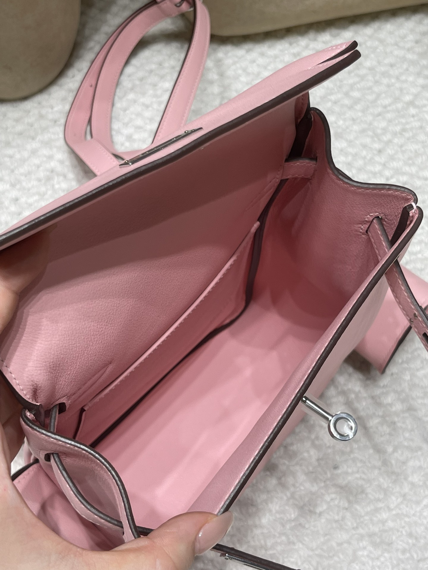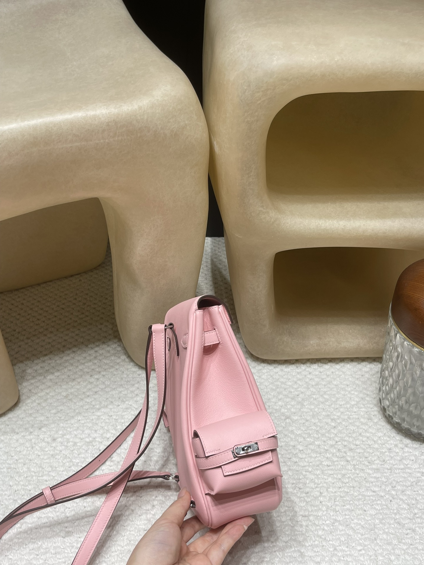 春の訪れを感じさせる柔らかなピンク「Rose Sakura(ローズサクラ)」カラーの「Kelly jump」ダブルショルダーバッグが入荷いたしました!Swift 3Q のサイズは高身長の方にもバランス良くフィットし、幅広肩紐の調節機能で肩への負担を軽減しながら、長時間の背負いにも優しい仕様です。側面の小ポケットにはスマホや化粧ポーチをすぐに取り出せ、通勤やデート、ショッピングなどさまざまなシーンで活躍します。ローズサクラの優しい色合いと銀扣のエレガントなアクセントがマッチし、季節感溢れるコーディネートに一層の魅力を加えます。高機能性と可愛らしさのハーモニーが光るこの 1 点、是非春のコレクションに加えてください!