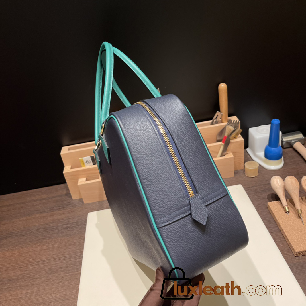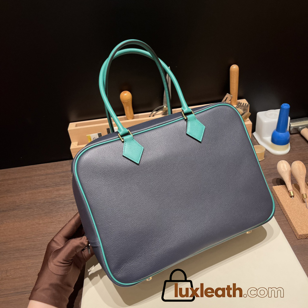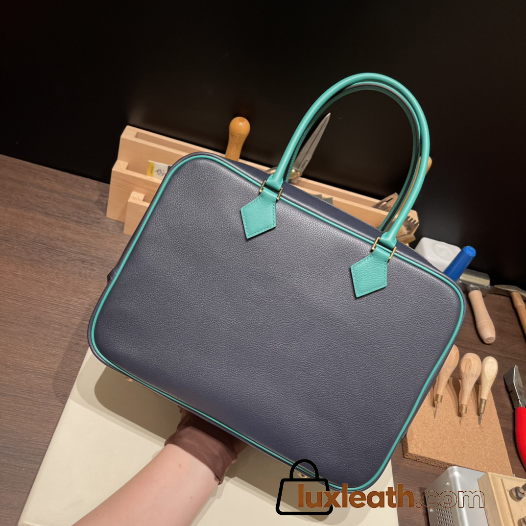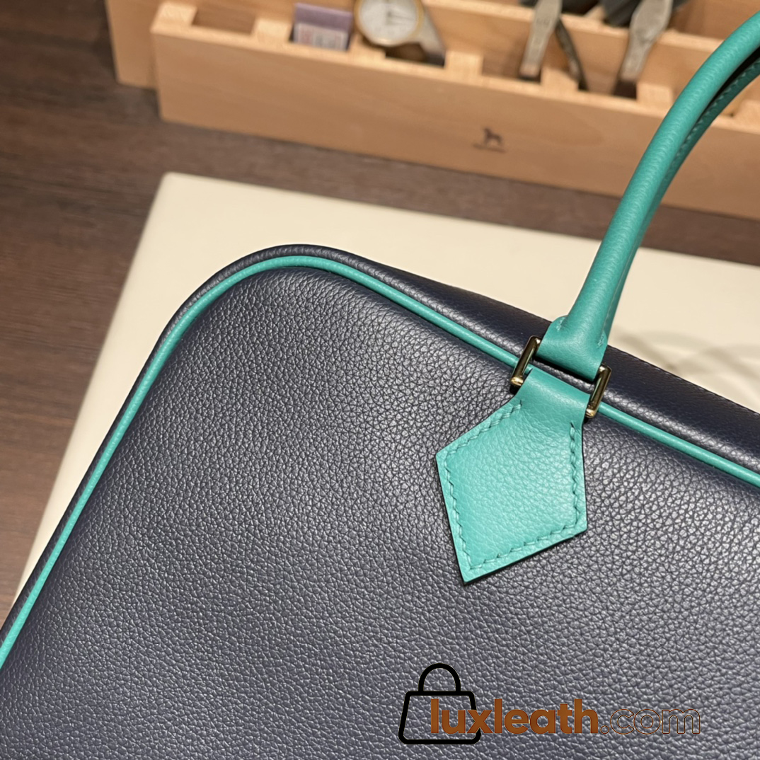 Hermès Plume 32 Evercolor 73/Blue Saphir X Vert Verone Silver Hardware Plume-002 Fully Hand-Stitched