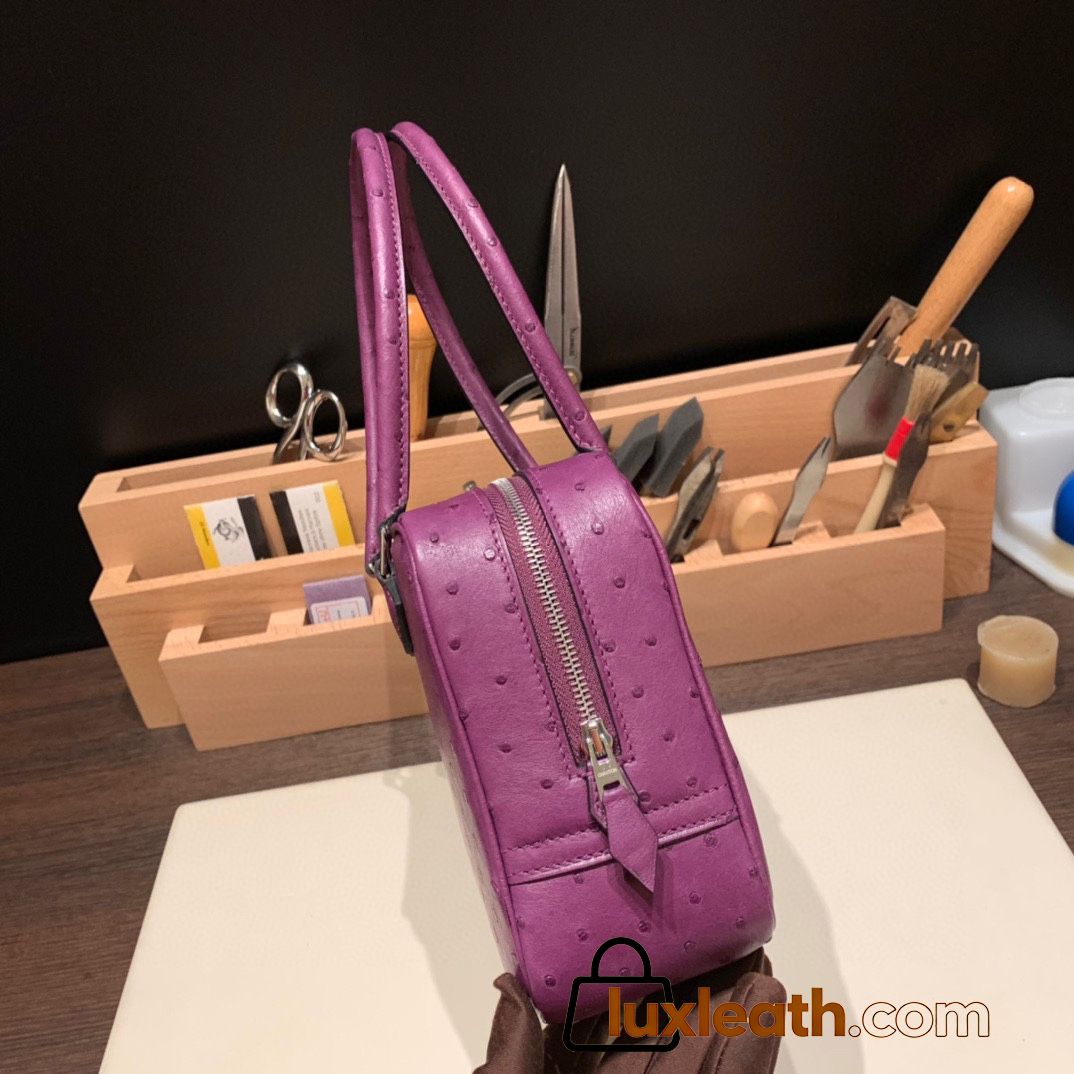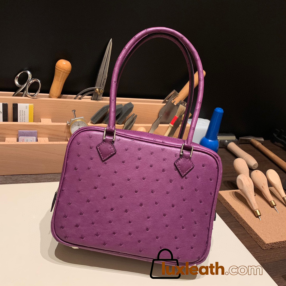 Hermès Plume 21 Ostrich P9/Anemone Silver Hardware Plume-008 Fully Hand-Stitched