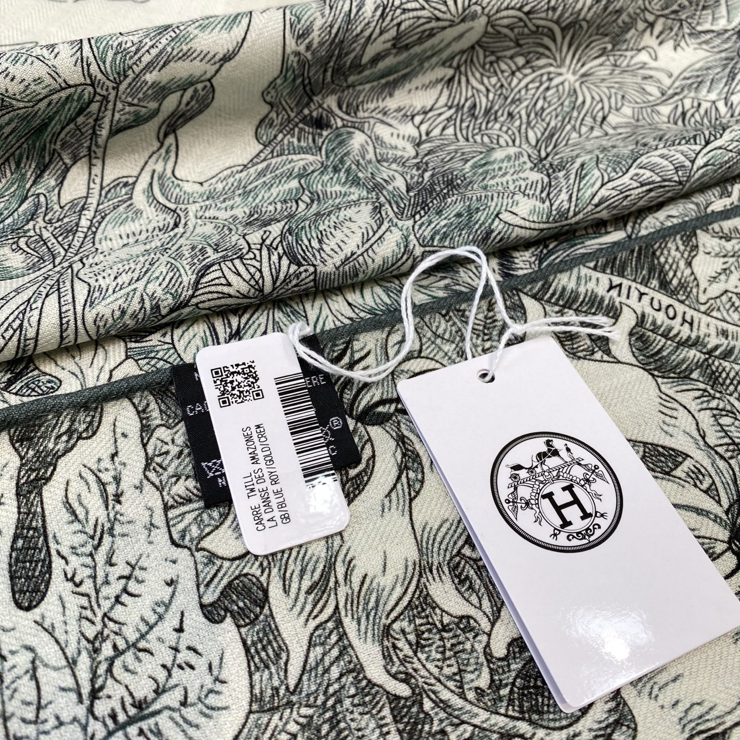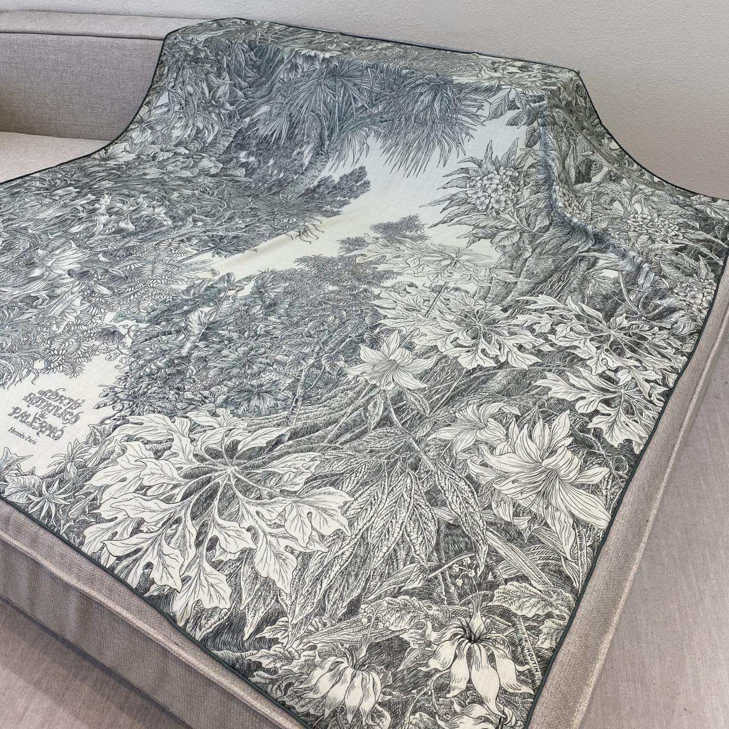 これは華やかで変化に富む庭園であり、イタリア風の絢爛な風景が広がる作品です:様々な地中海固有種と熱帯植物が共生し、繁茂した奇跡のような景観を構成しています。青々と茂るバンヤンの枝叶、ヤシの木、ソテツの隙間からは、18 世紀のロマンティックな建築の姿がかすかに窺えます。フランソワ・ウータン(François Houtin)はこのパレルモ植物園に足を踏み入れ、神秘的なバロック様式の緑の殿堂の中で長時間彷徨い、目にした美しい風景を華やかで優雅なスカーフのデザインへと昇華させました。