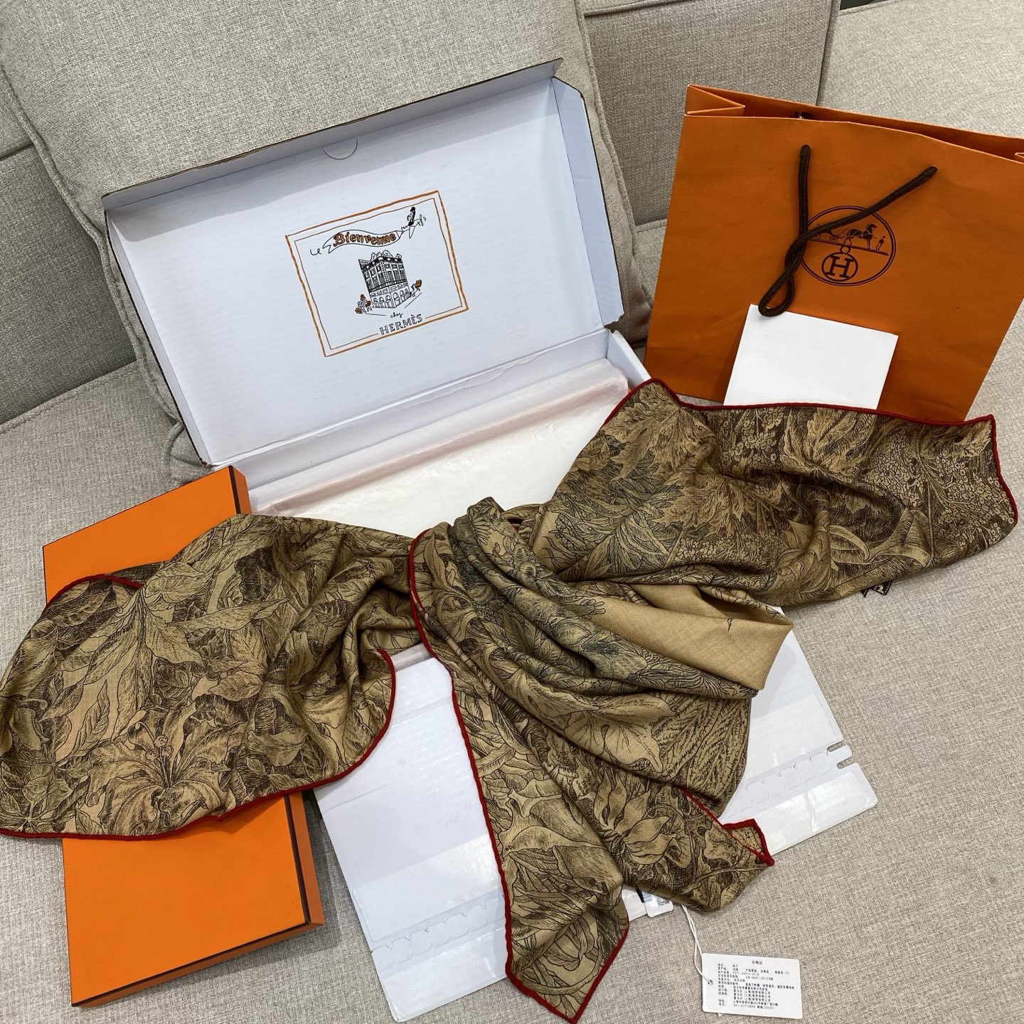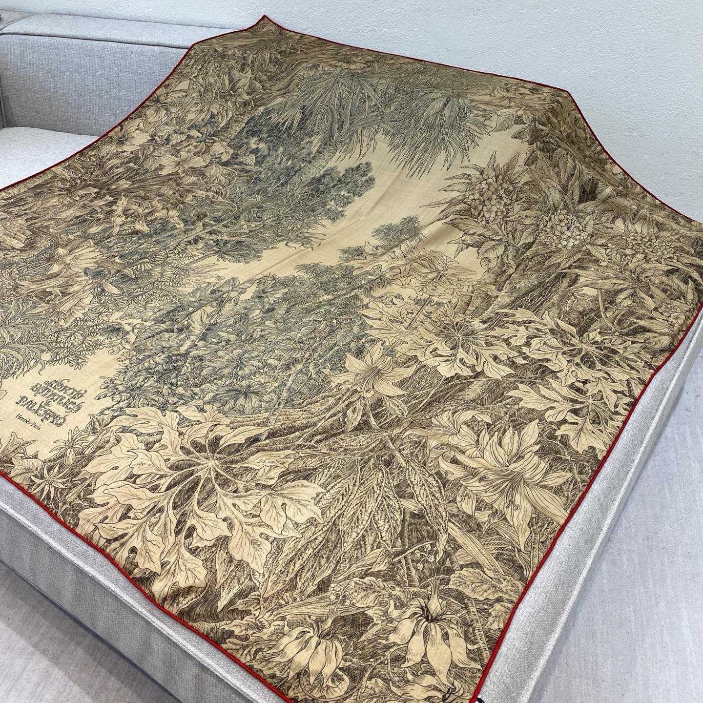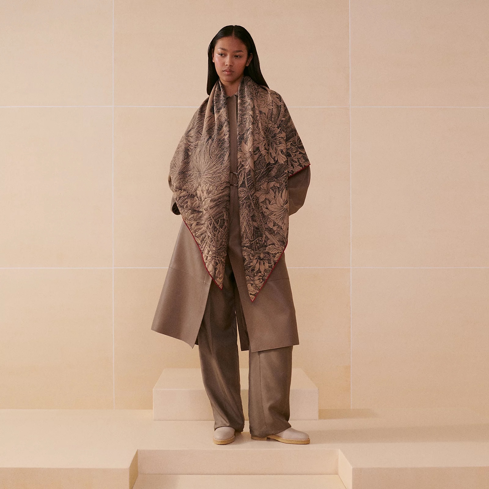 これは華やかで変化に富む庭園であり、イタリア風の絢爛な風景が広がる作品です:様々な地中海固有種と熱帯植物が共生し、繁茂した奇跡のような景観を構成しています。青々と茂るバンヤンの枝叶、ヤシの木、ソテツの隙間からは、18 世紀のロマンティックな建築の姿がかすかに窺えます。フランソワ・ウータン(François Houtin)はこのパレルモ植物園に足を踏み入れ、神秘的なバロック様式の緑の殿堂の中で長時間彷徨い、目にした美しい風景を華やかで優雅なスカーフのデザインへと昇華させました。
