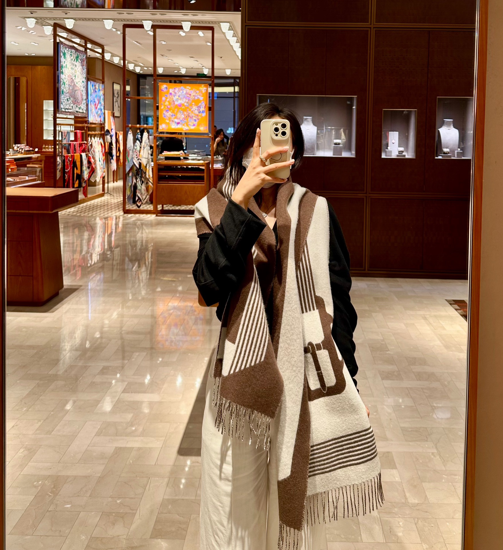 新品サドルストラップ(鞍帯)cashmereスカーフ:ジオメトリック柄で騎士スタイルを凝縮し、ジャガード編み工芸を採用。エルメス特有の「騎士」テーマのスカーフデザインを取り入れ、生き生きとした馬術風を立体的に表現しています。柄はシンプルかつ大気なデザインで、男性女性問わず使用可能で、クールな印象を与えます。「1.1 オーダーメイドレベル」の精緻な工芸を誇り、着用すると全体の OOTD(今日のコーディネート)の高級感を一気に引き上げます!