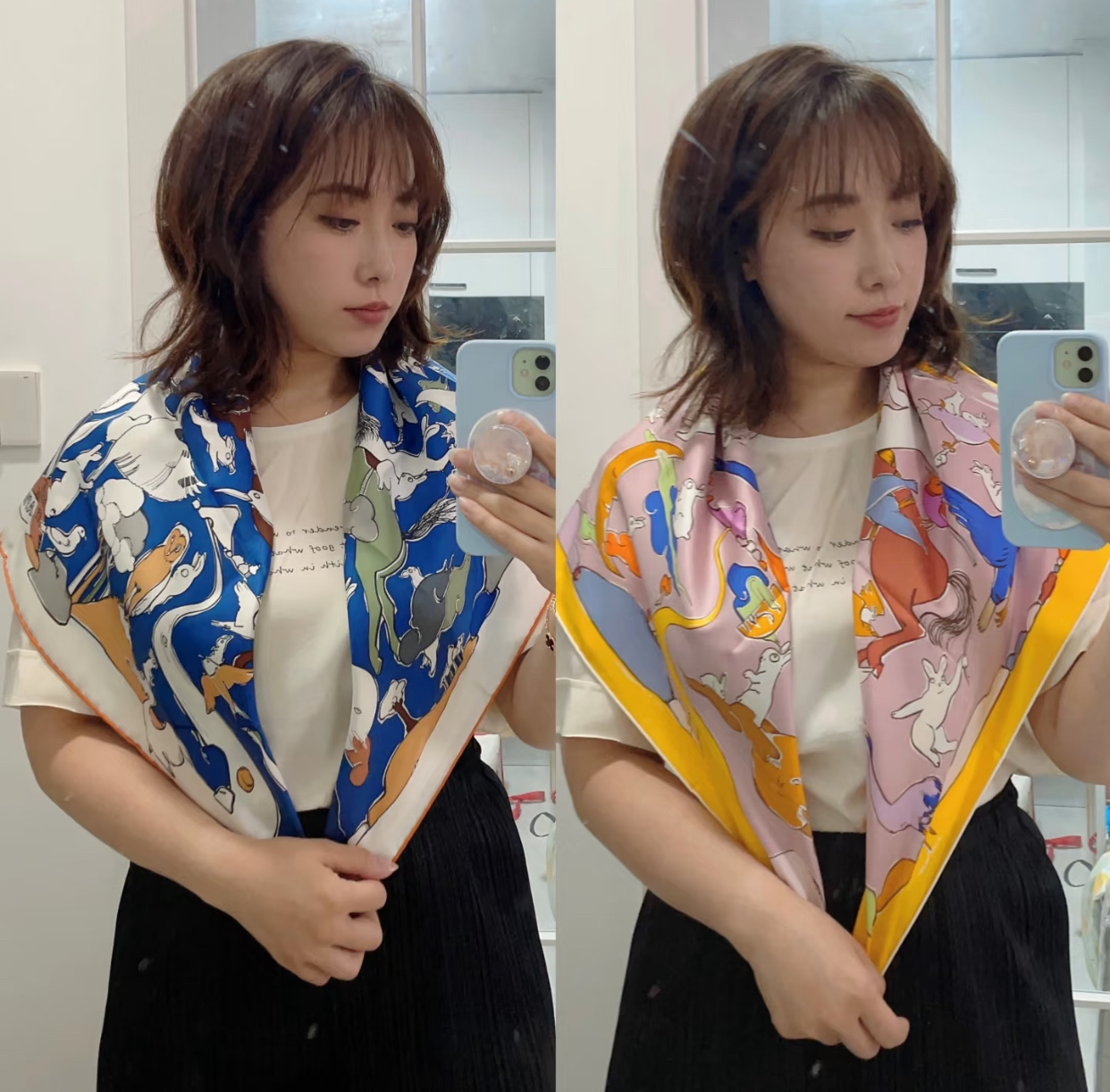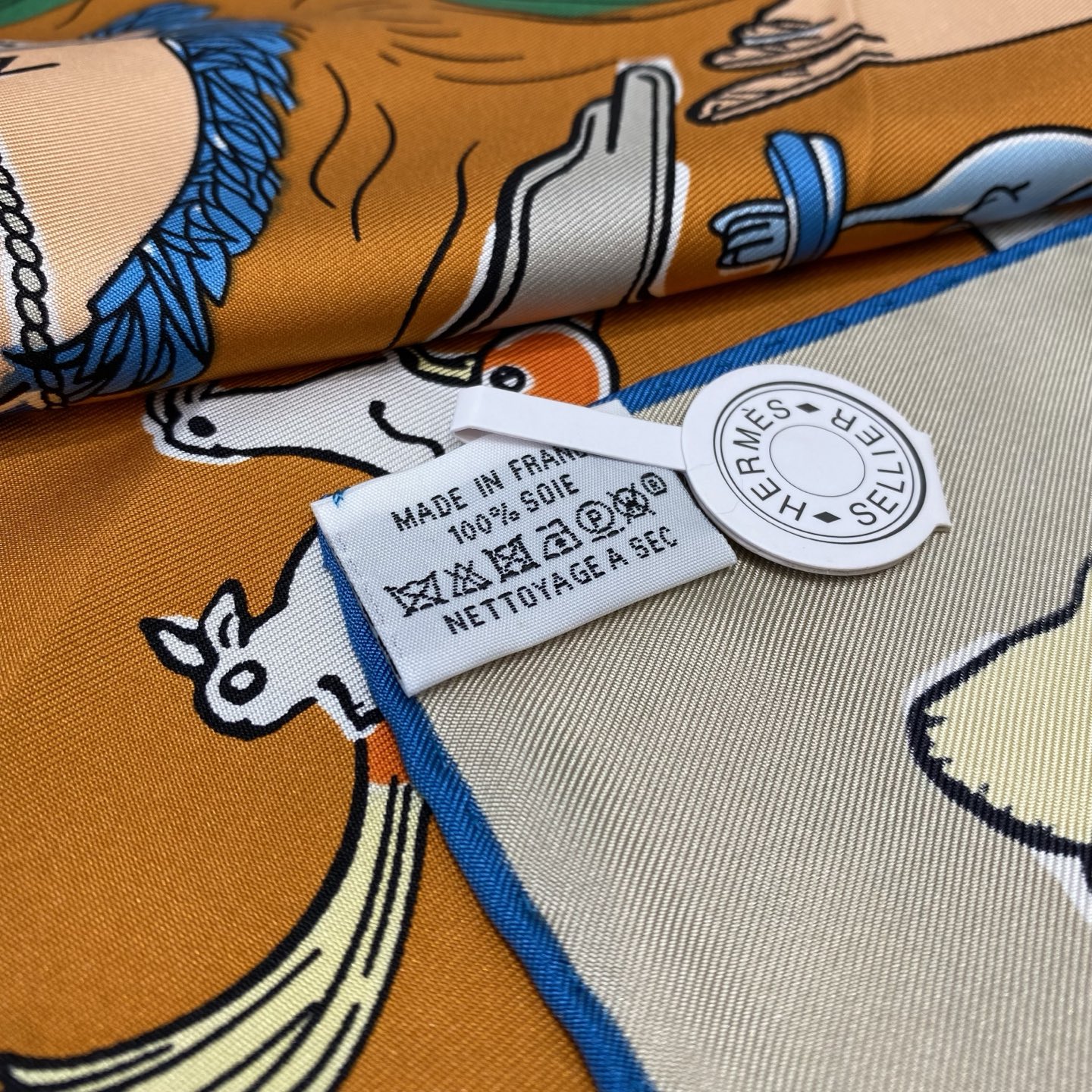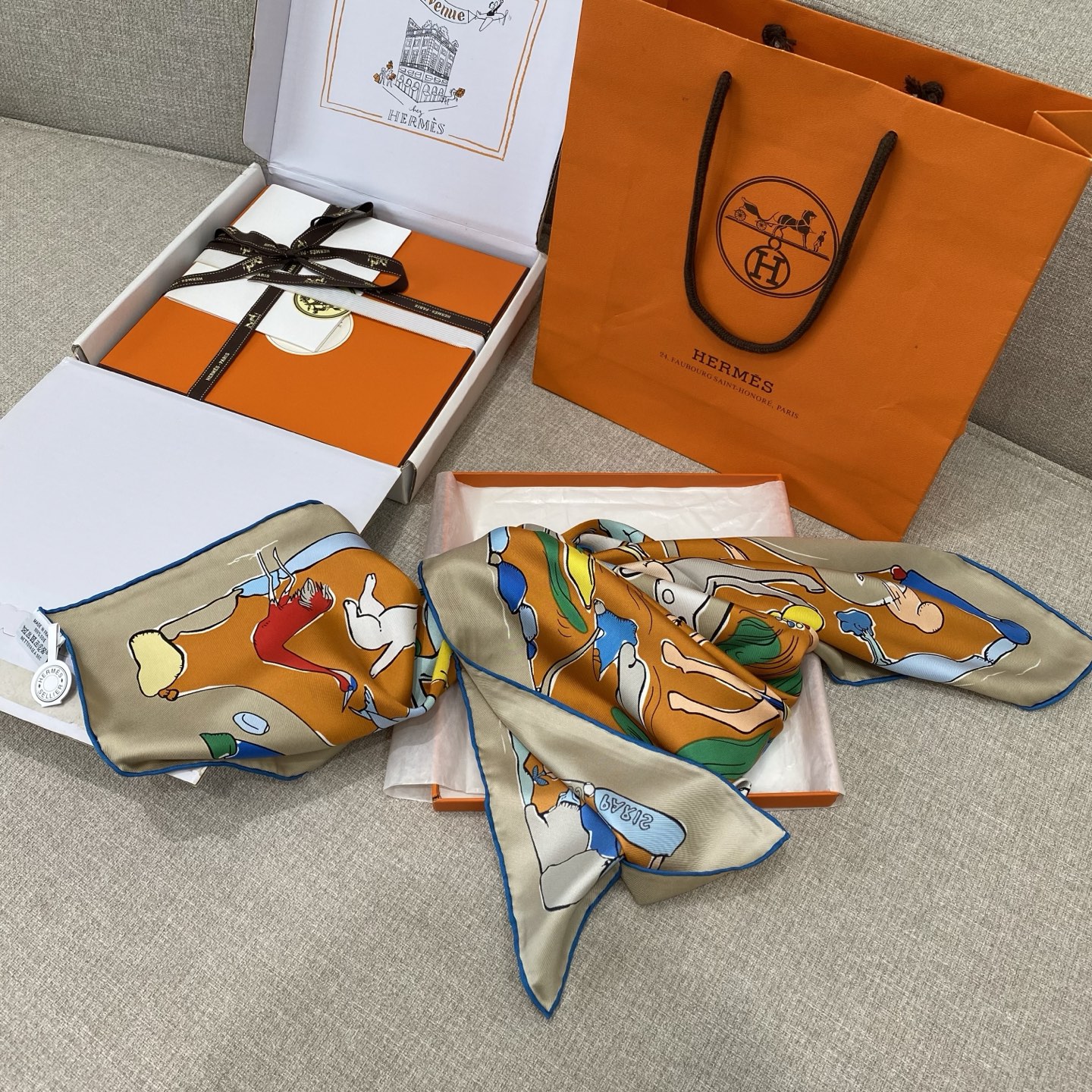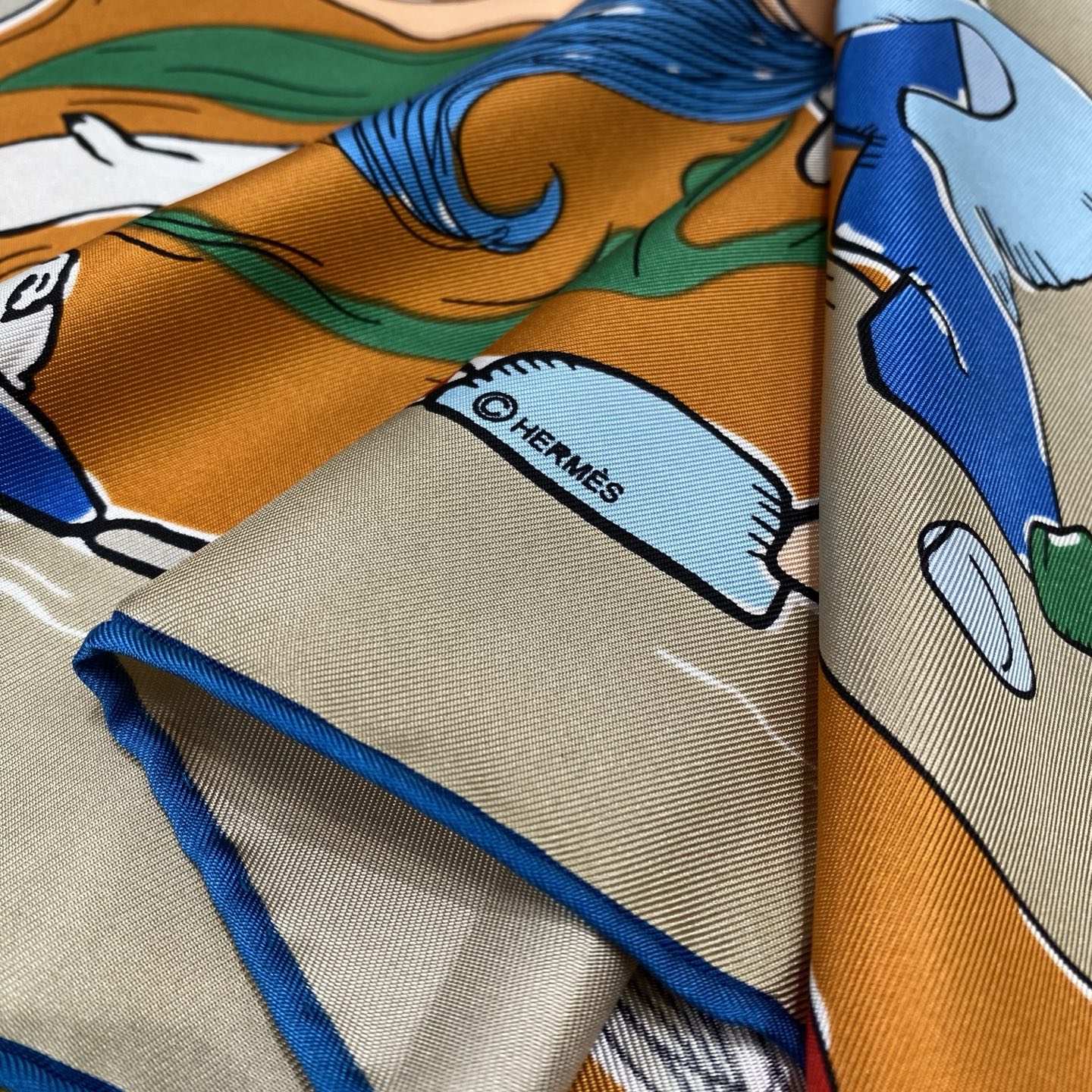 「Mille et un lapins(ミーユ・エ・アン・ラパン)」スカーフのデザインからインスピレーションを受けて制作:魔術師は帽子の中からウサギを一頭取り出す方法を知っていますが、カワハラシンスケ(信介河原/Shinsuke Kawahara)は自身の筆から、いったいどれだけのウサギを生み出せるのでしょう?彼はあまりにも多くのウサギを創り出し、まるで「ウサギの雨」が降ってくるような光景となり、これらのウサギたちは自然の風景の中で嬉しそうに跳ね回っています。小さなウサギたちは興奮して、馬の群れの中にさえ混乱を引き起こしています。馬たちは本来、次の障害走りの試合の前にゆっくり休むつもりでいました。しかし、ウサギたちこそが本当の跳躍の達人だとは思いもしませんでした。誰が一番高く跳べるのでしょう?賭けてみませんか!