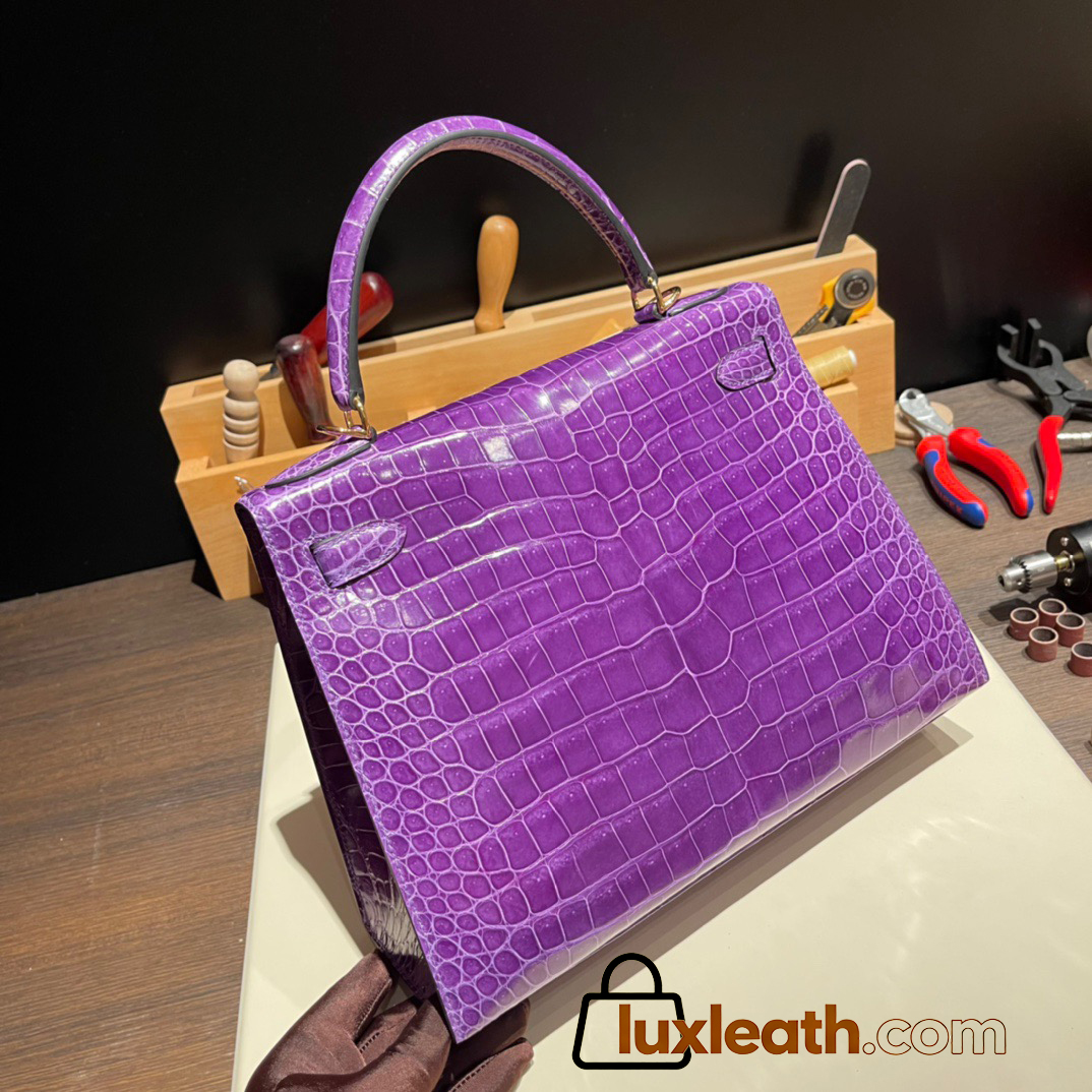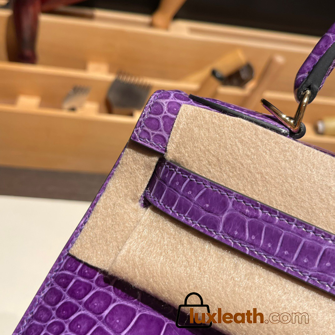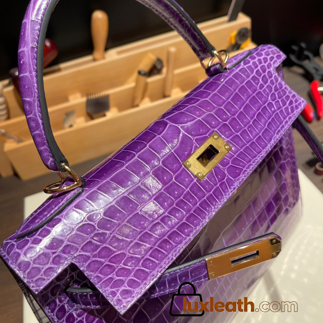 Hermes Kelly 28CM Porosus Crocodile 96 / Violet GoldHardware 033