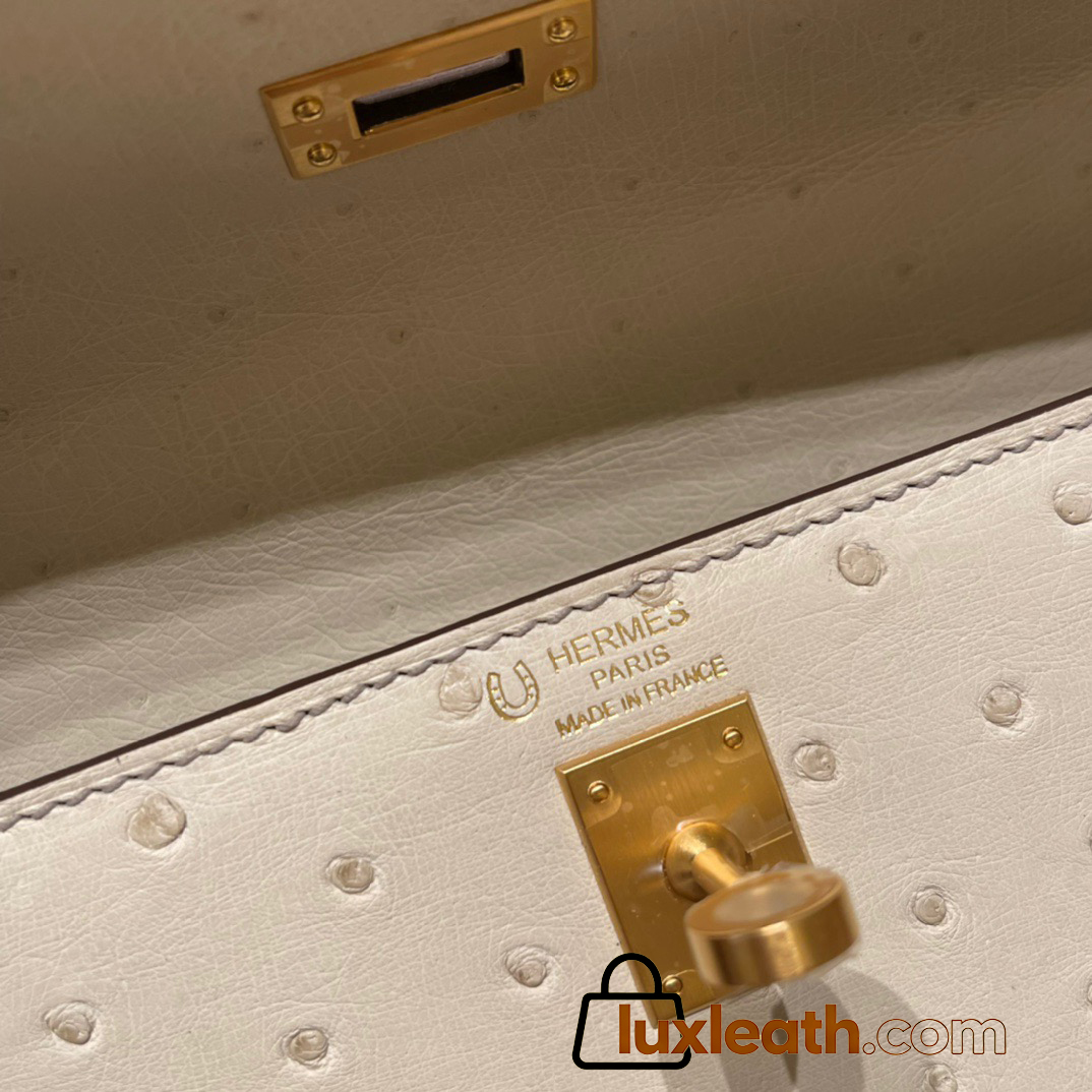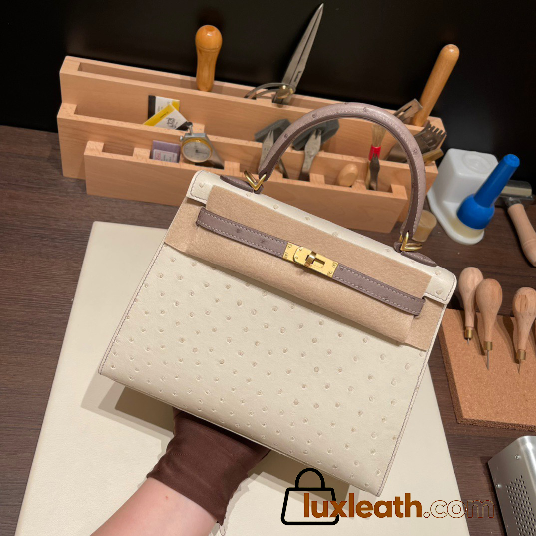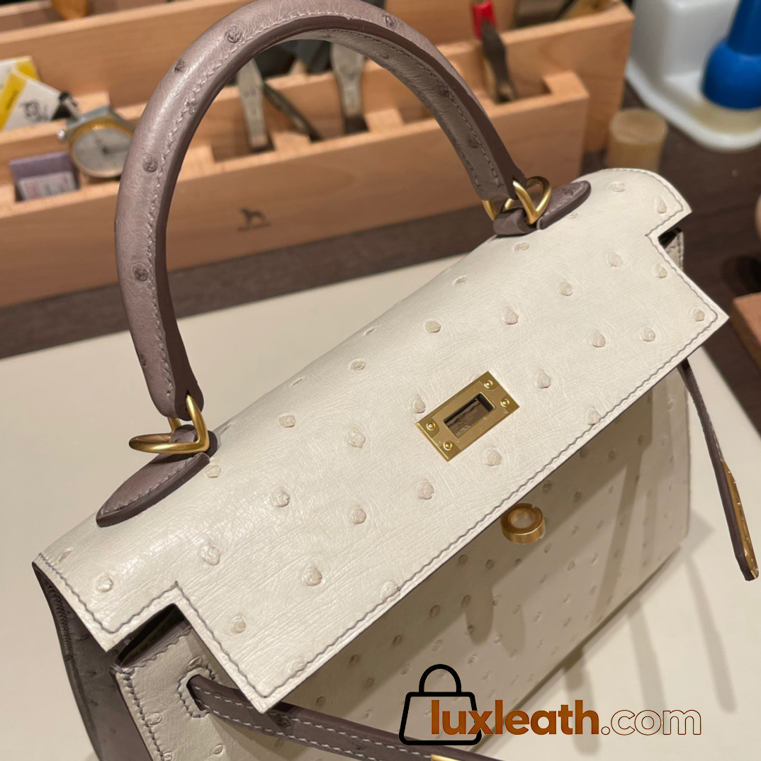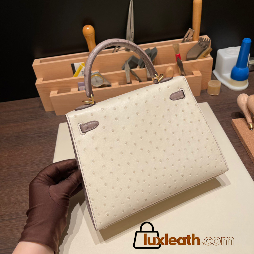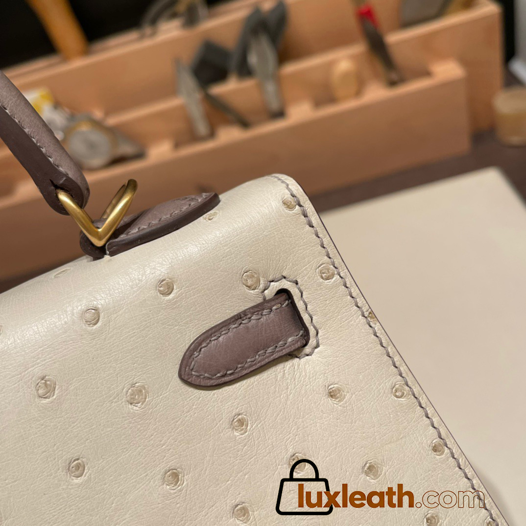 Hermes Kelly 25cm sellier Ostrich 3C/ Parchemin& M8/Gris Asphalt Gold Hardware  Full Handmade 010