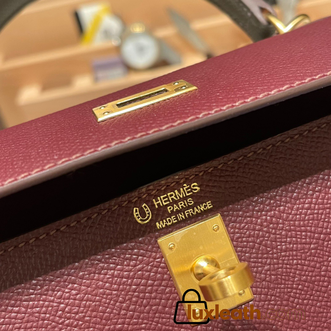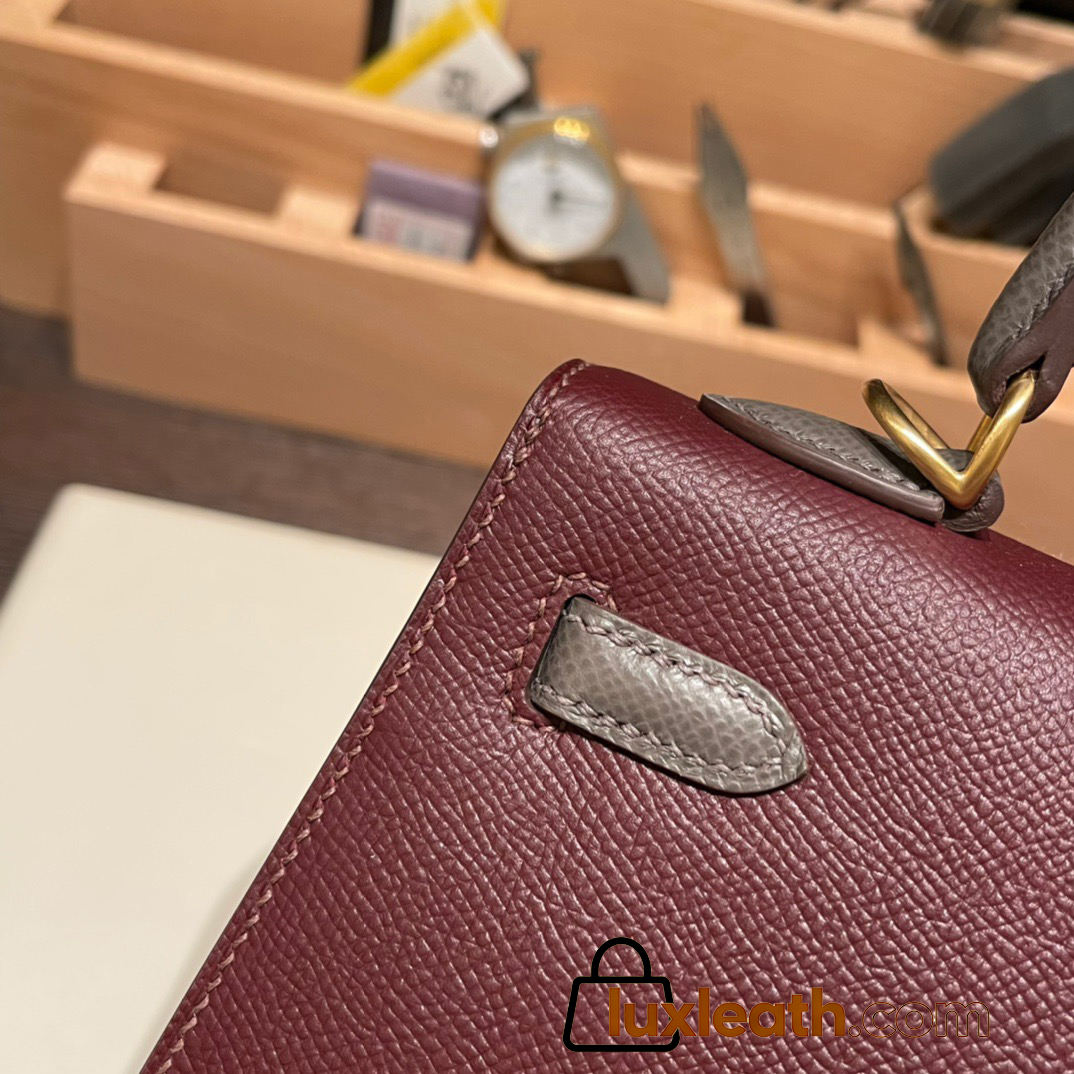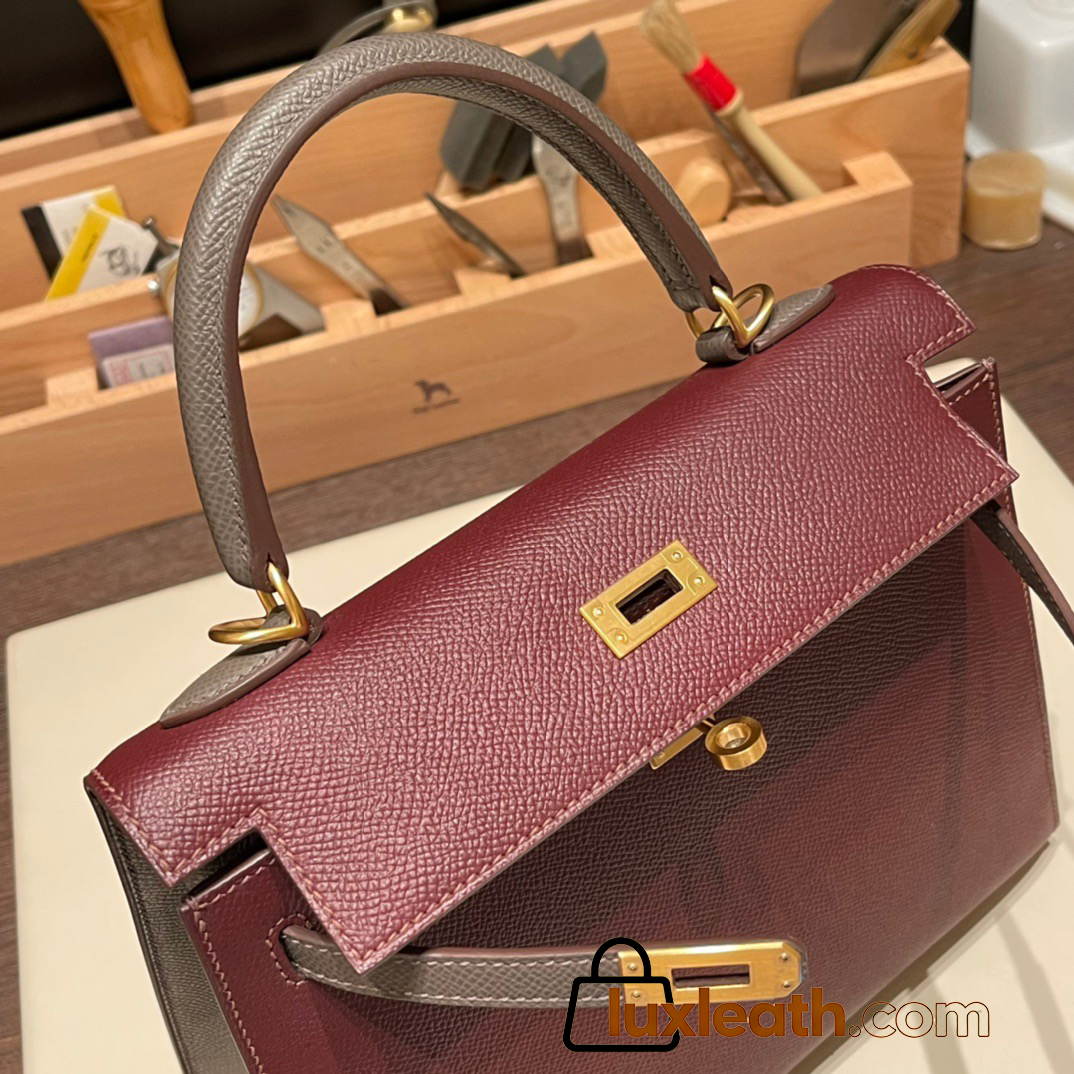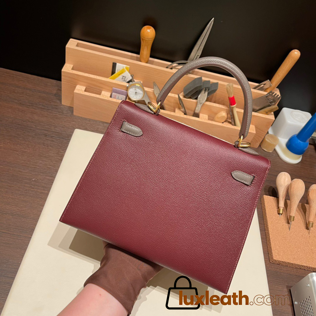 Hermes Kelly 25cm sellier Epsom touch 57/ Bordeaux & 8F/ Etain Gold Hardware Full Handmade 052