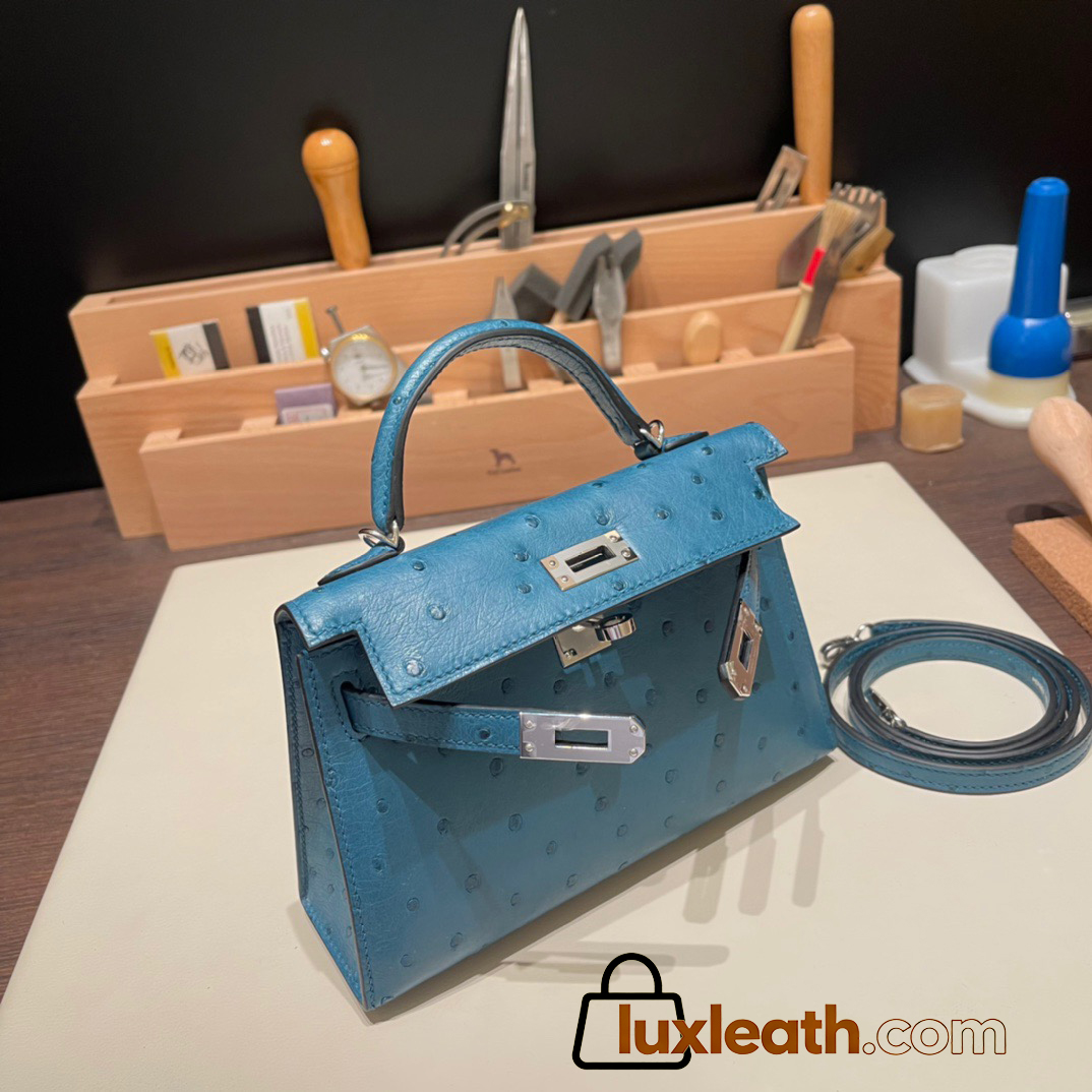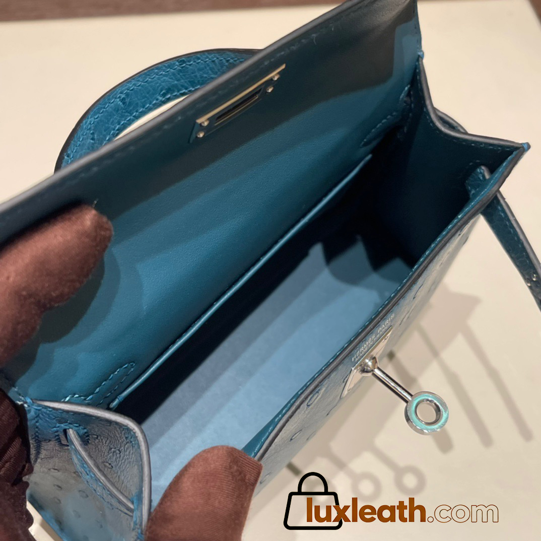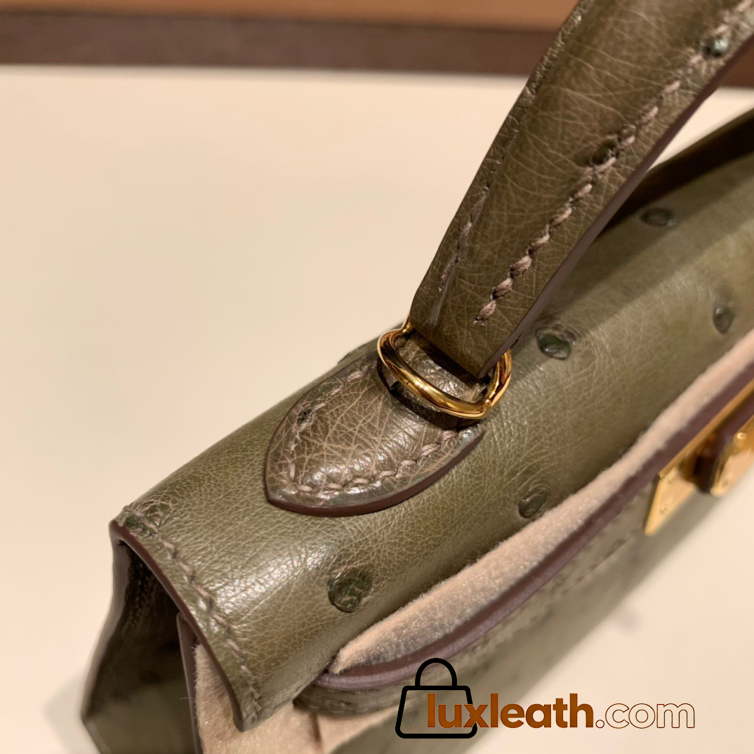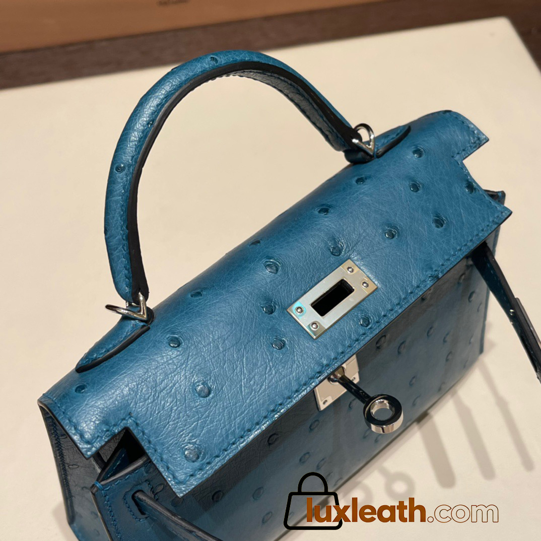 Hermes kelly20 ostrich 19cm W0 /Vert Bosphore Silver Hardware Full Handmade kellymini-023