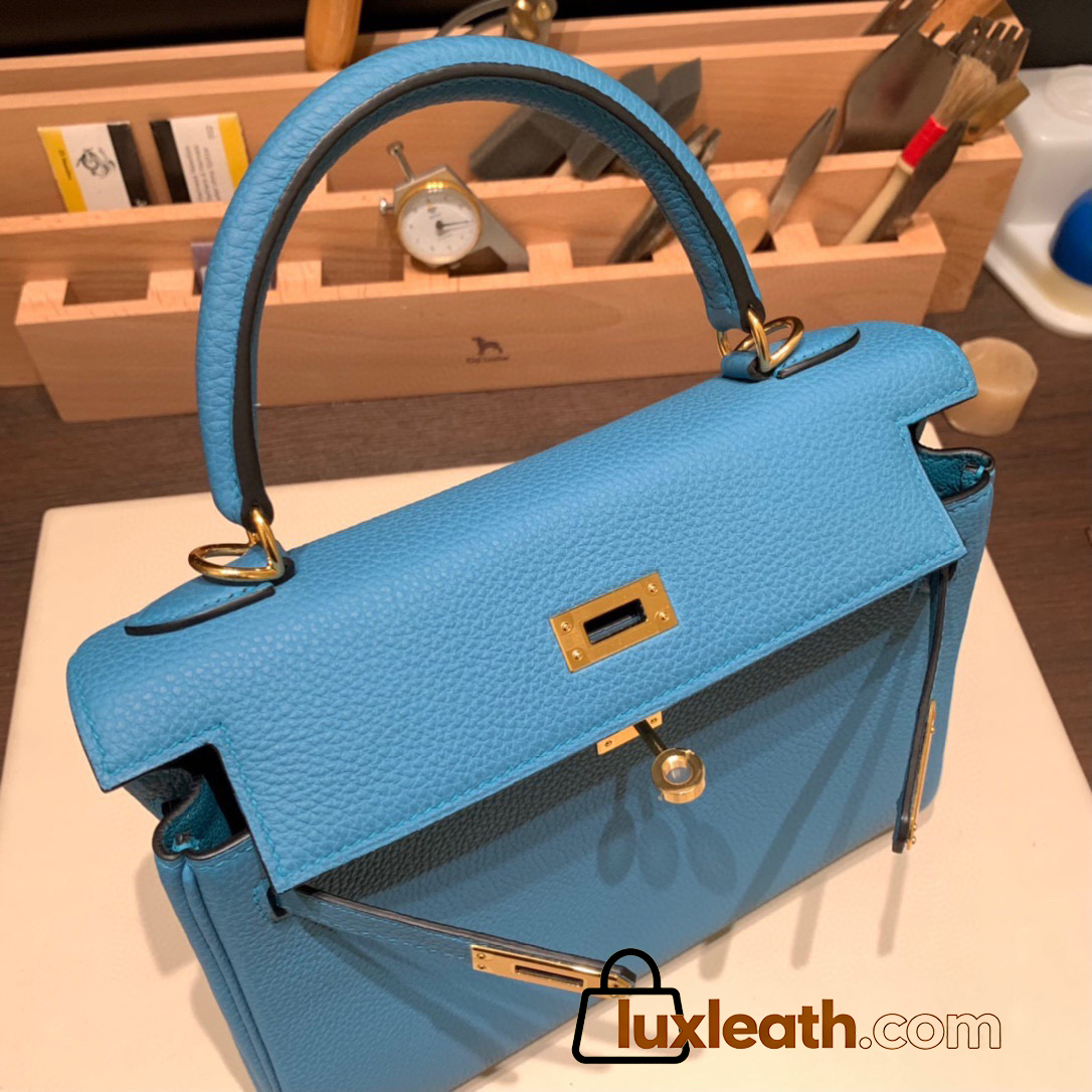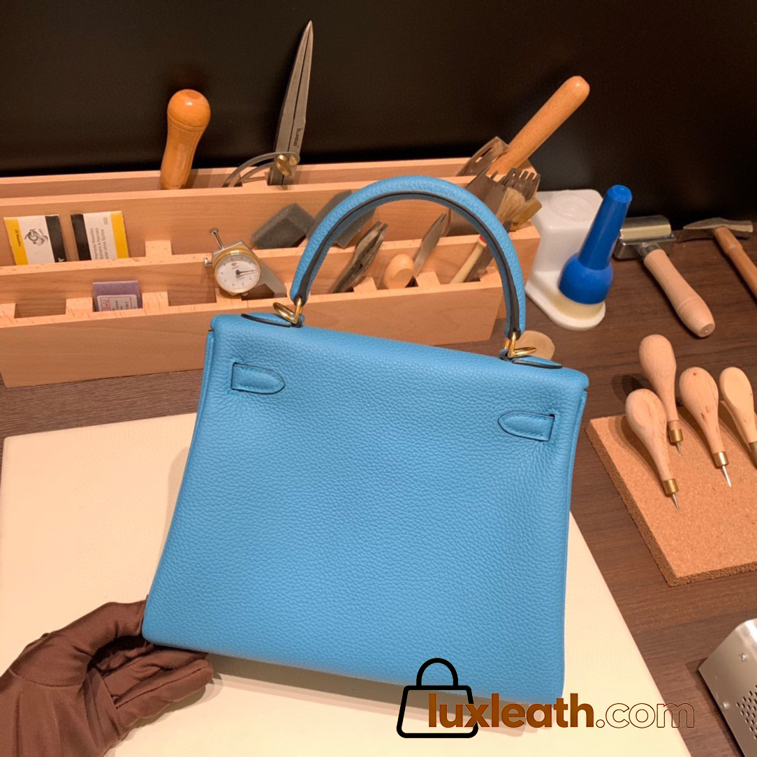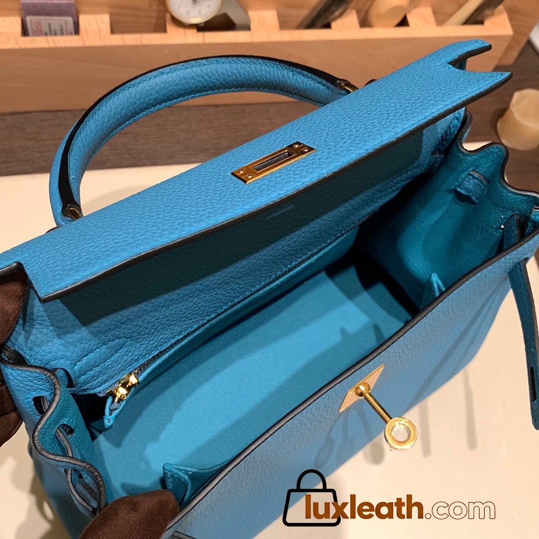 Hermes Kelly 25cm togo 7B /Turquoise Blue Gold Hardware Full Handmade 038