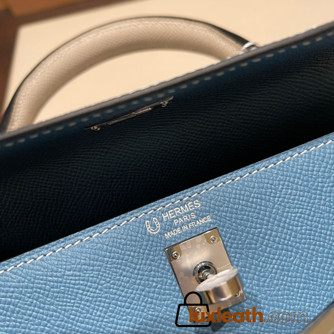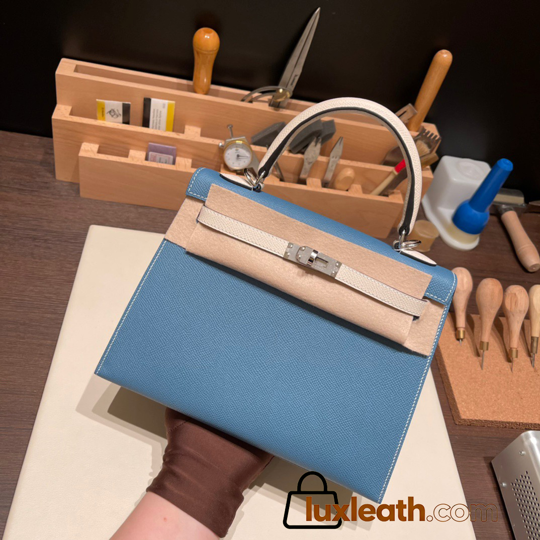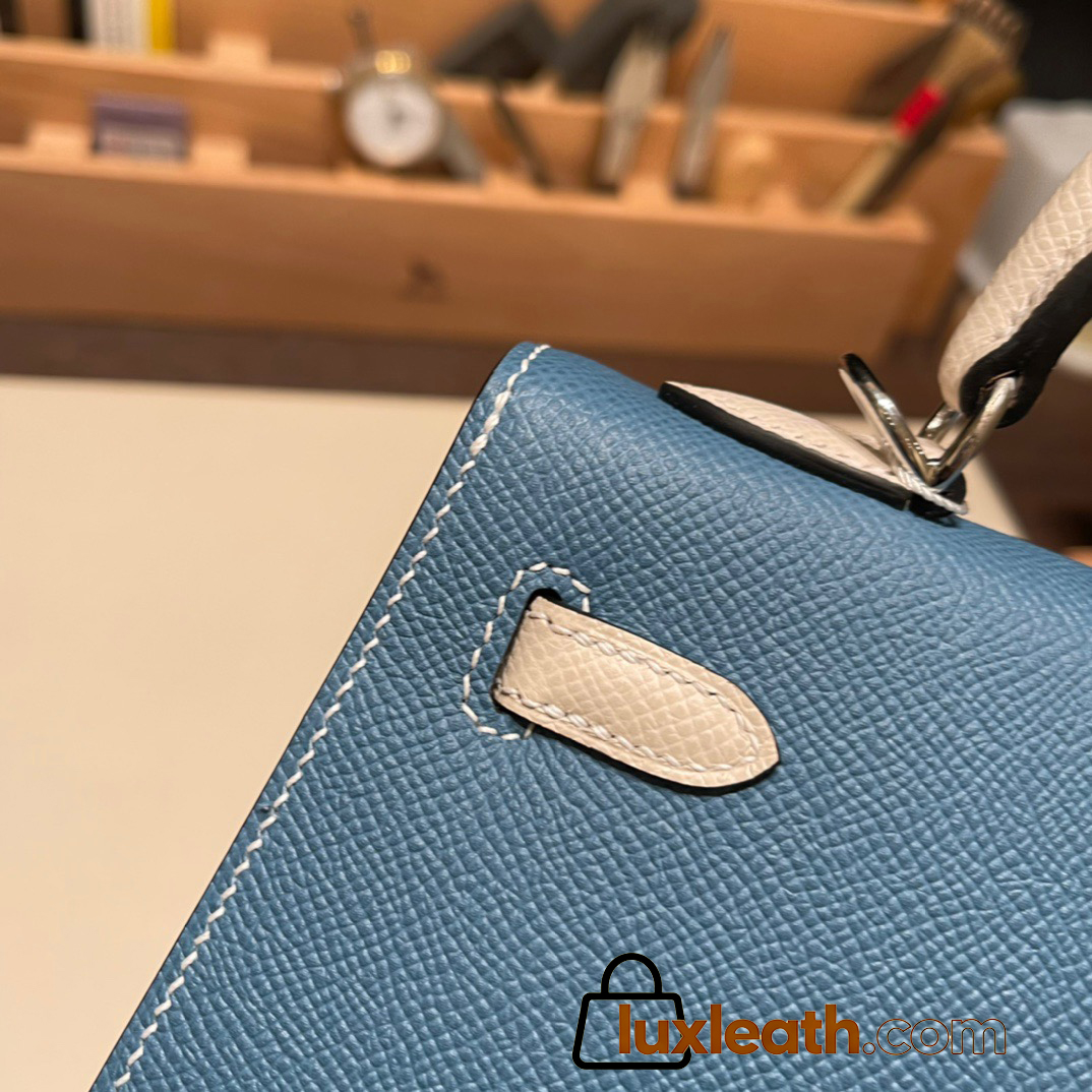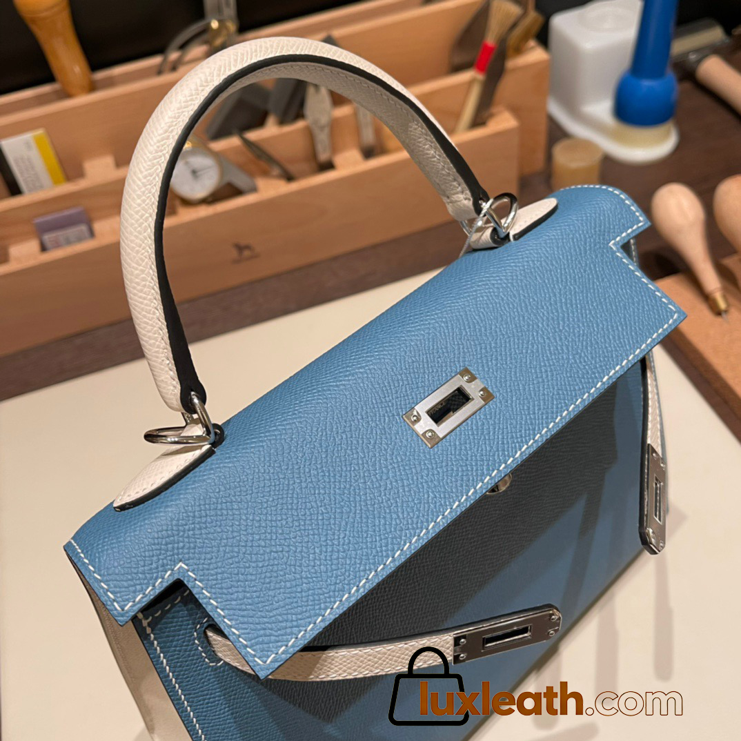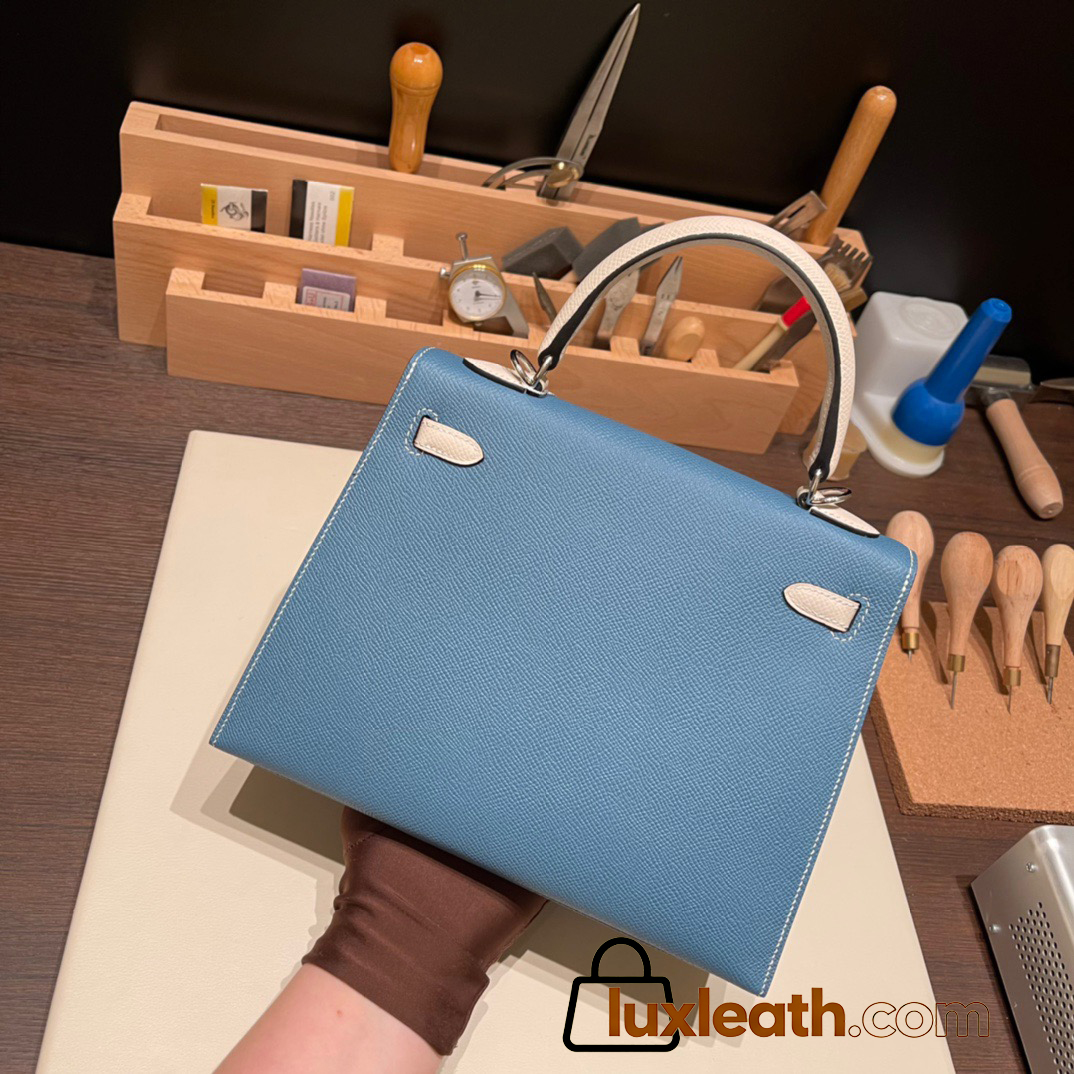 Hermes Kelly 25cm sellier Epsom 75/Blue Jean & 10 /Craie Silver Hardware Full Handmade 096