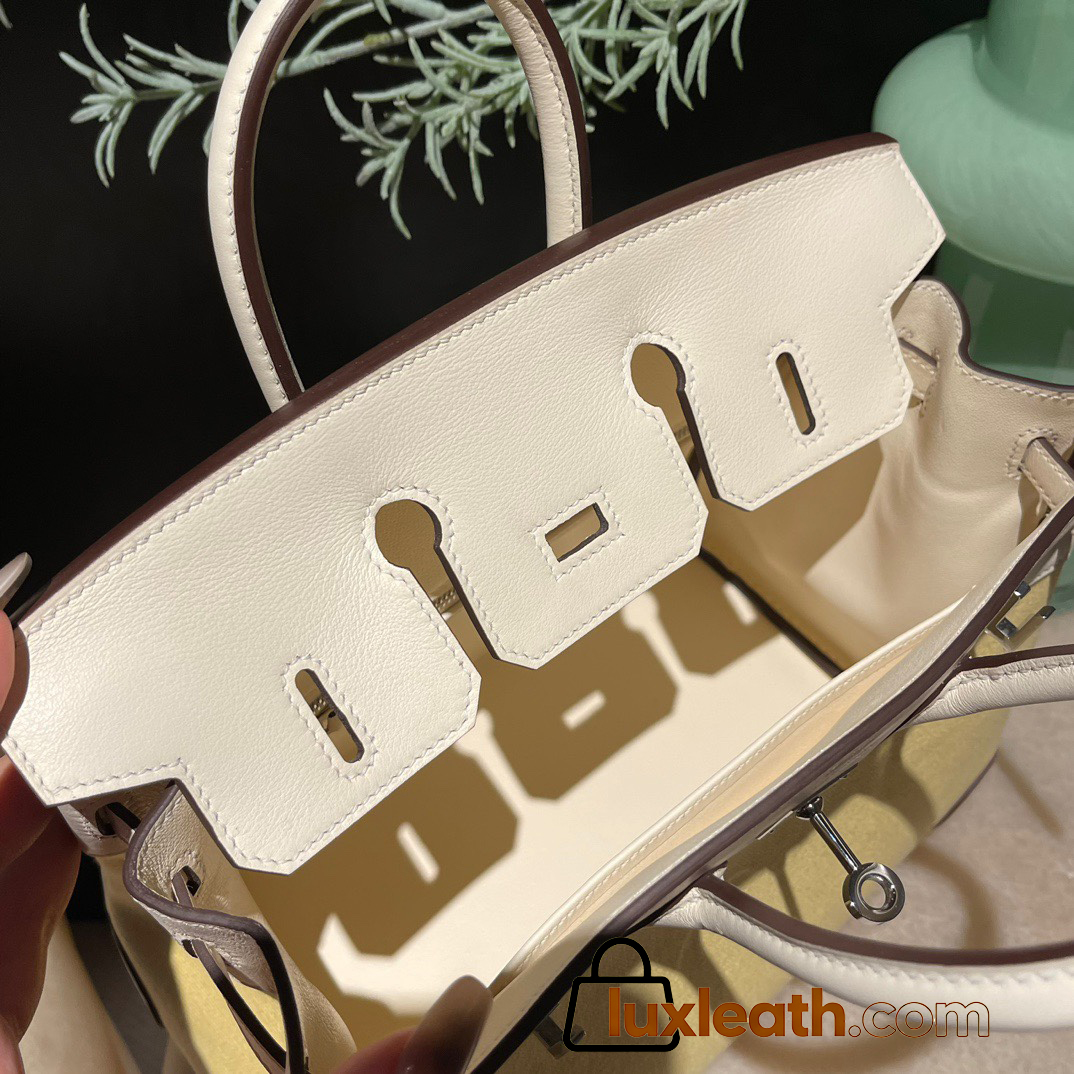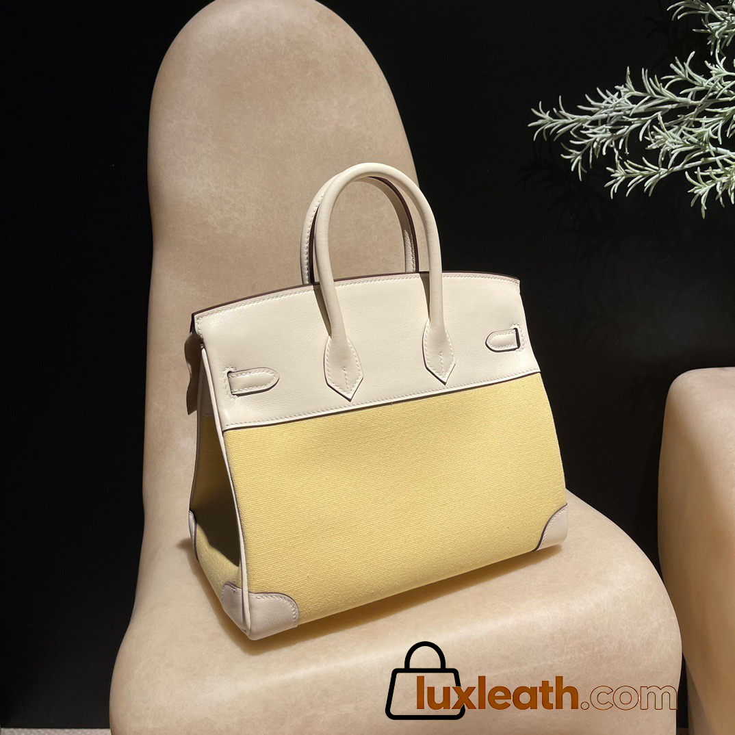 Hermès Birkin 25 (Triomphe H Canvas & Swift Leather) – Color: I2/Nata (with Silver Hardware) – A soft cream-white hue – This model is characterized by a combination of high-quality Swift leather and lightweight canvas. The natural cream-white color create