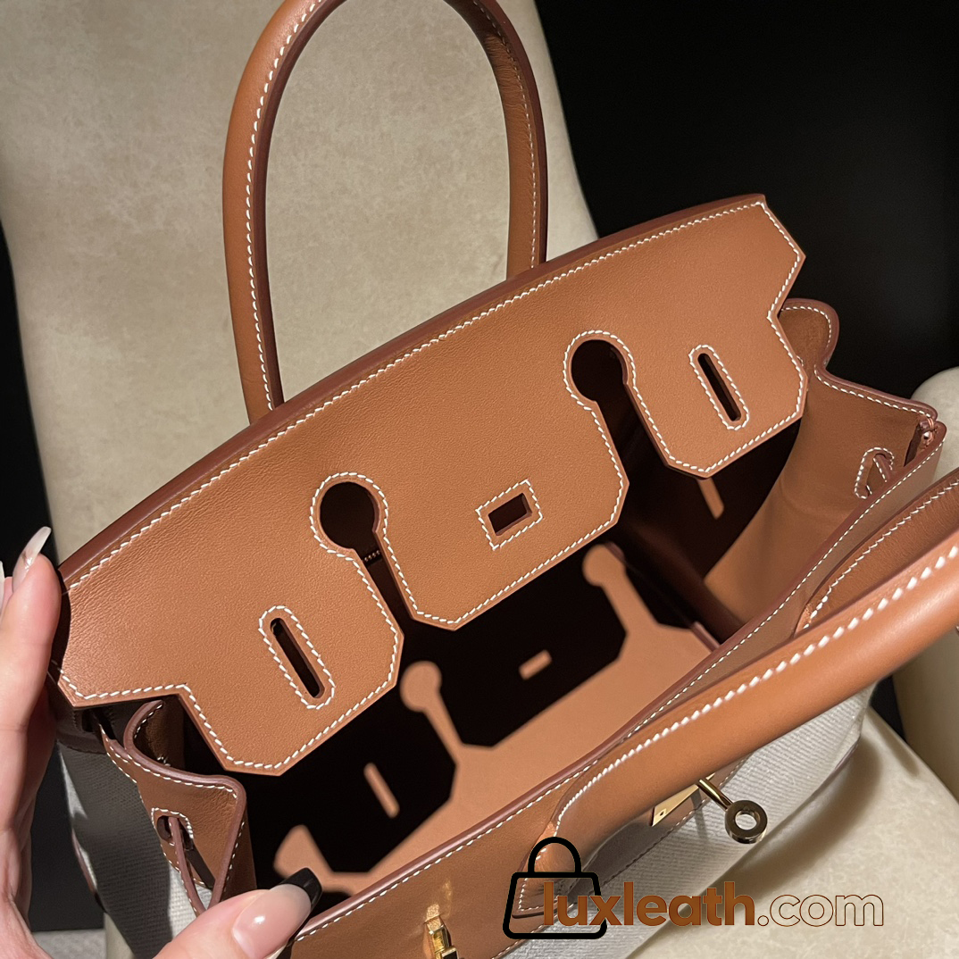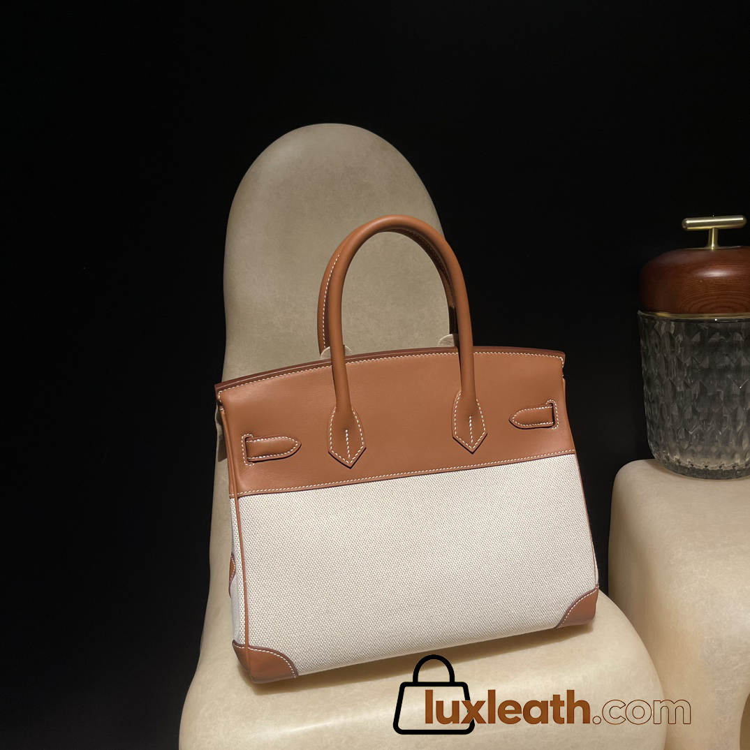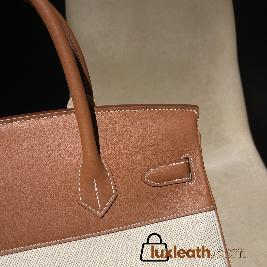 Hermès Birkin 30 (Swift Leather & Canvas) – Color: 37/Gold with Gold Hardware The attractive fusion of Swift leather and canvas creates an elegant vintage style – a rare model with great collector value.