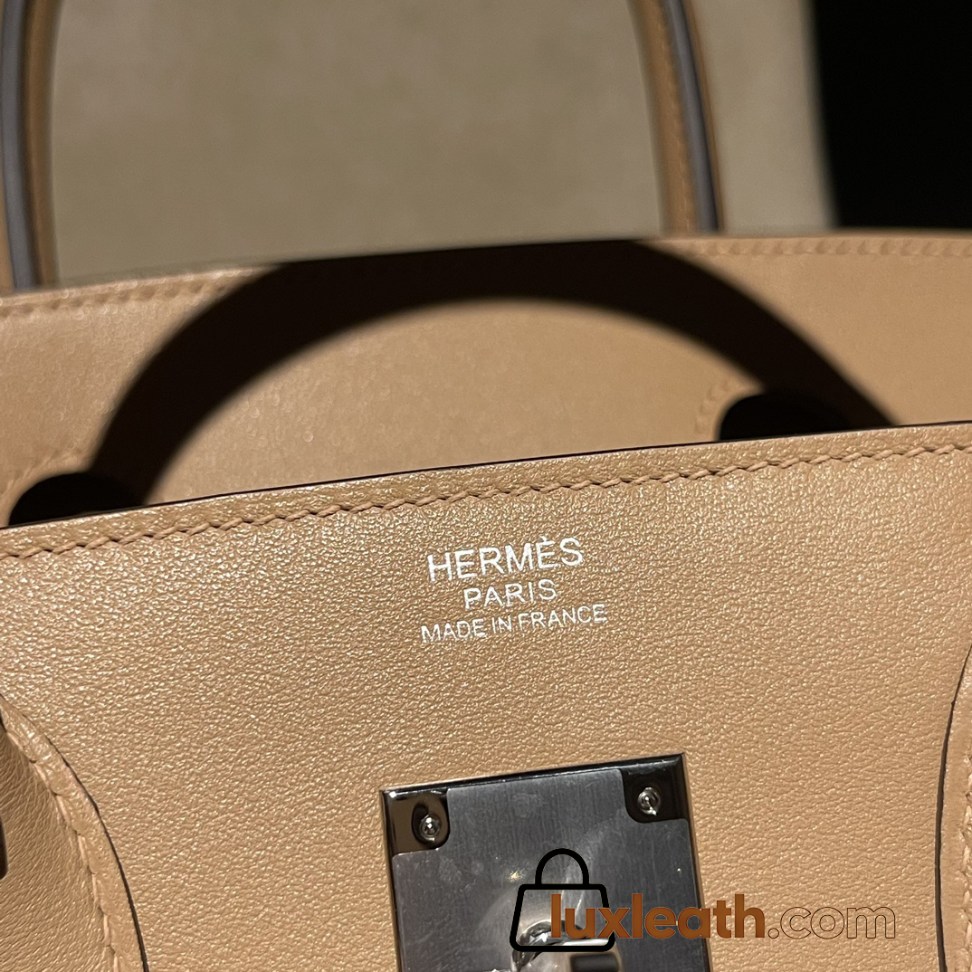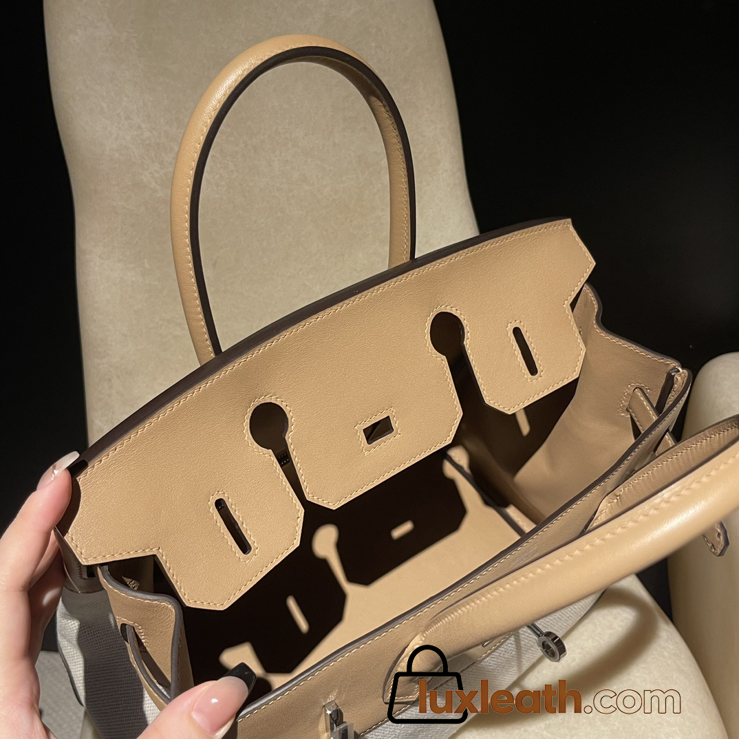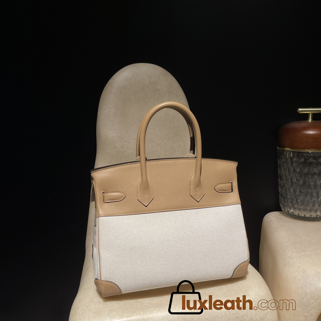 Hermès Birkin 30 (Canvas & Swift Leather) – Color: 0M/Chai with Gold Hardware The casualness of the canvas and the soft texture of Swift leather are charming – lighter and easier to use than full-leather models, fitting for a youthful style.